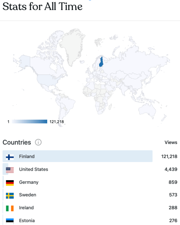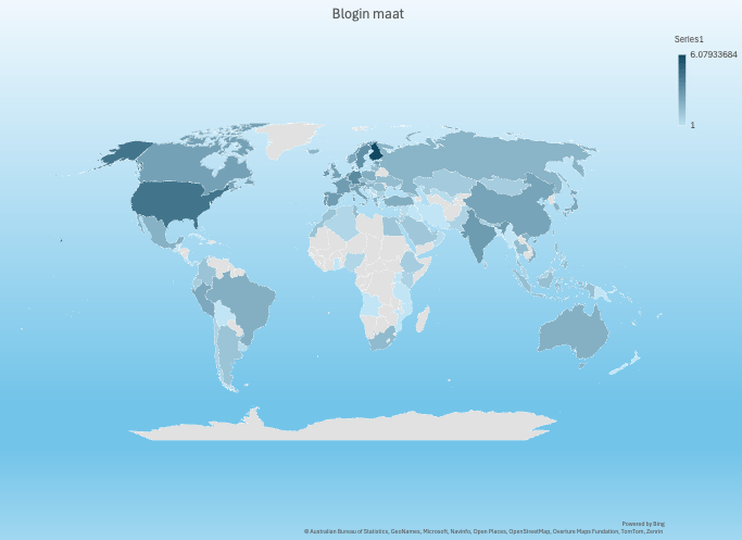 Katselin tämän blogin statistiikan countries-sivuja. Siellä näkyy mistä maista ja kuinka monta kertaa sivuilla on vierailtu. Sivulla on myös vuorovaikutteinen kartta, joka näyttää vierailut maittain. Koska Suomen osuus on niin suuri muihin maihin verrattuna ja värityksen häive on lineaarinen, kartasta ei suoraan näe maiden välisiä eroja. Niinpä tein omat karttani Google Sheetsissä ja Excelissä.