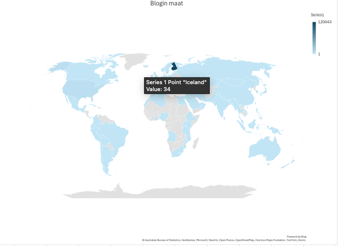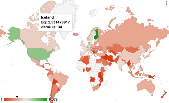 Kartta näytti hyvältä. Kun siirsin hiiren osoittimen jonkun maan kohdalle, niin näin vierailujen määrän. Tosin eri maiden välistä eroa ei näe kartan värityksen perusteella, koska Suomen kävijämäärä 120000 on liian iso suhteessa muihin arvoihin. Tarvittiin logaritmista asteikkoa. Käytin tässä 10-kantaista logaritmia.