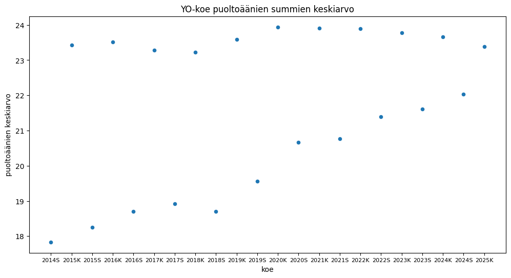 Syksyisin puoltoäänien summan keskiarvo on ollut pienempi kuin keväiden kokeissa. Toki ero on pienentynyt pikku hiljaa. Tästä saisi kivan tehtävän oppilaille. Jos kevään ja syksyn kokeisiin sovitetaan suorat, niin milloin ne leikkaavat?