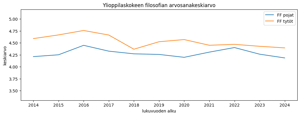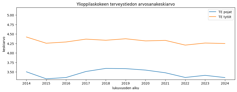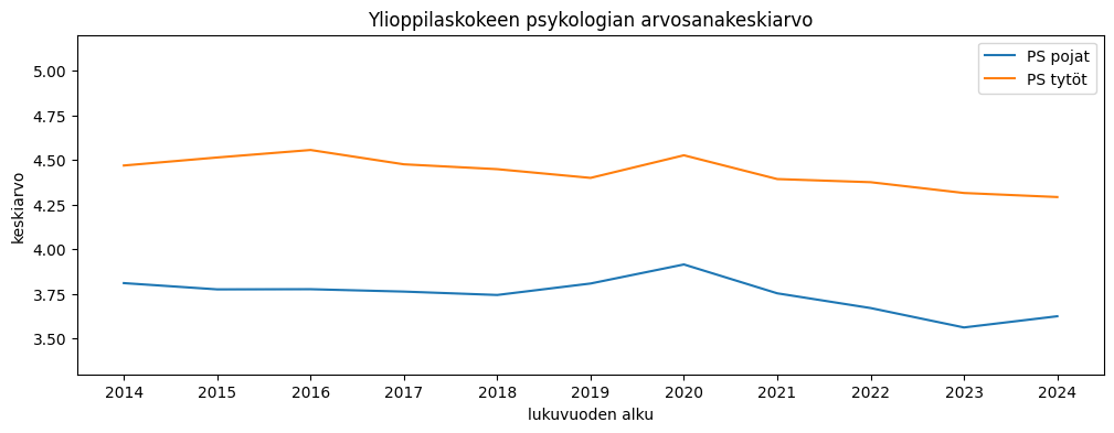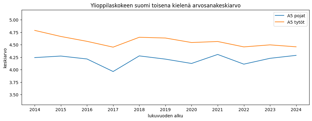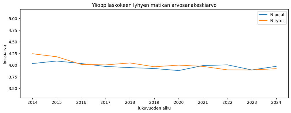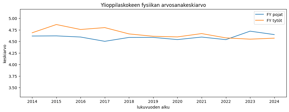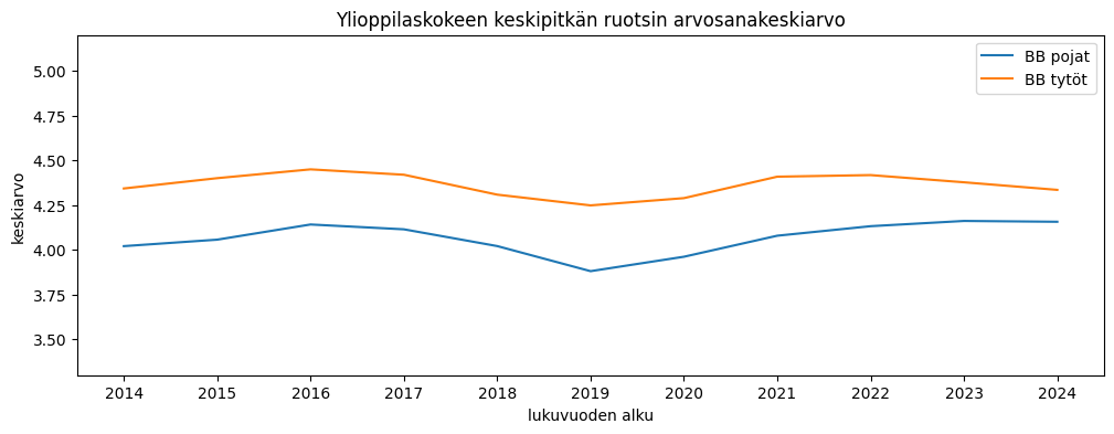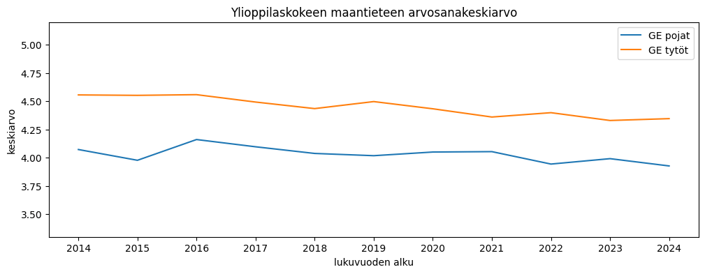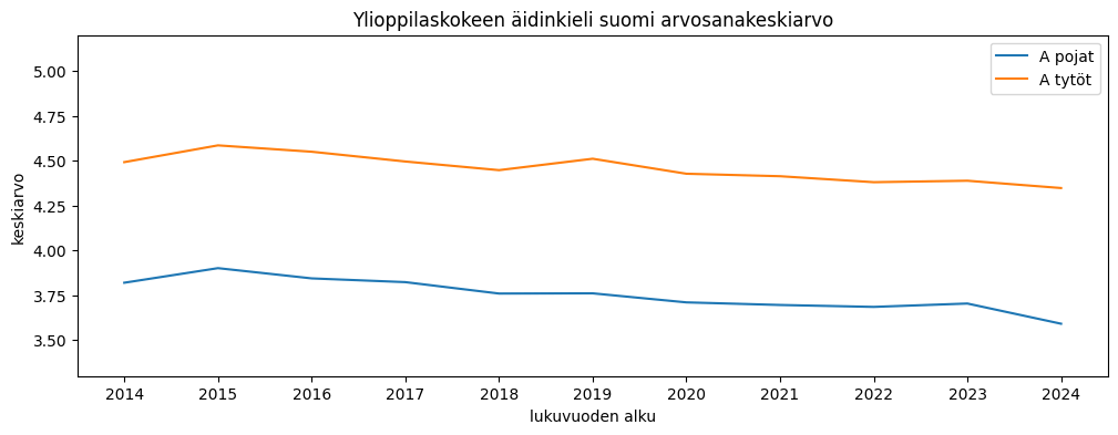 Ylioppilaskoearvosanojen keskiarvo saadaan jakamalla puoltoäänien määrä kirjoitettujen aineiden määrällä. Tyttöjen arvosanakeskiarvo on pudonnut pikkaisen, pojilla muutosta on vähemmän. Tänä vuonna erotus oli noin 0,15 arvosanaa tyttöjen eduksi.