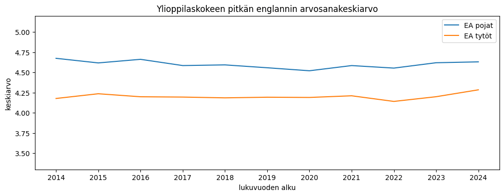 Pitkä englanti on ainoa aine, missä poikien arvosanat ovat reilusti parempia kuin tyttöjen. Tänä vuonna poikien pistekeskiarvo oli 0,4 arvosanaa parempi kuin tytöillä.