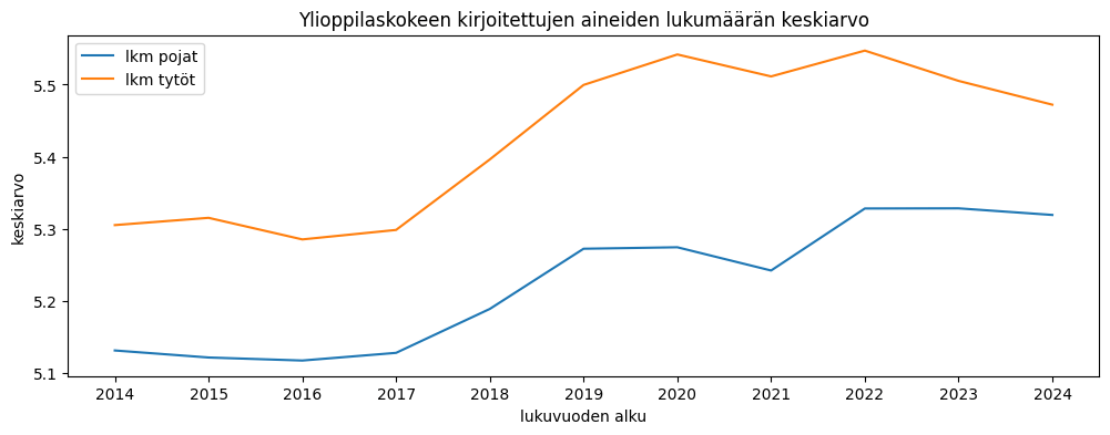 Tästä eteenpäin syksyn ja seuraavan kevään kokeet on yhdistetty koko lukuvuodeksi. Alla olevassa taulukossa yht tarkoittaa puoltoäänien keskiarvoa ja lkm kirjoitettujen aineiden lukumäärän keskiarvoa.