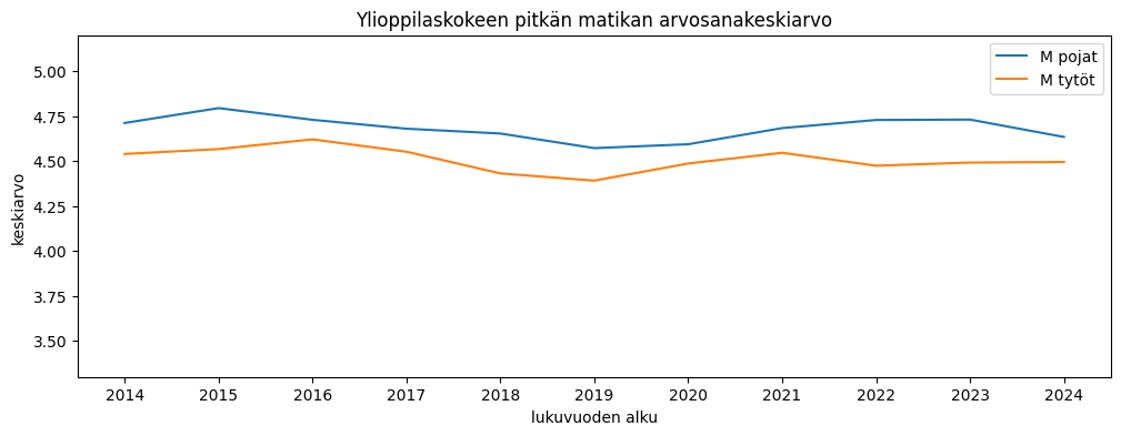 Pitkässä matikassa poikien arvosanat ovat pysyneet noin 0,1 – 0,3 arvosanaa parempina kuin tyttöjen.