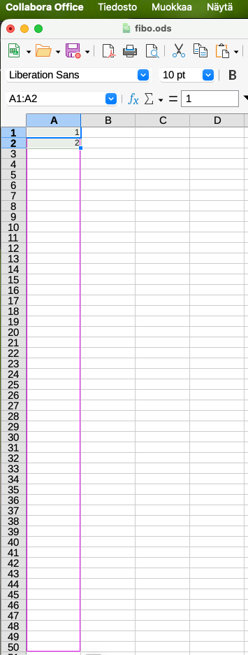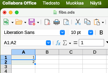 Lisätään kaksi ensimmäistä Fibonaccilukua ja laskukaava B-sarakkeelle.