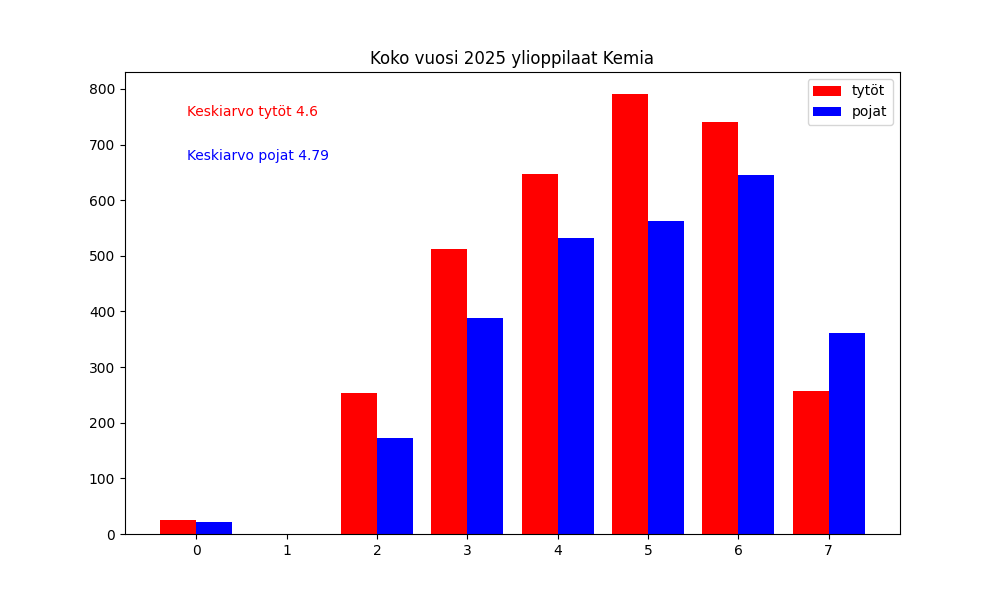 Kemiassa poikien keskiarvo oli 0,20 arvosanaa parempi kuin tytöillä. Erotus on tilastollisesti erittäin merkitsevä (p < 0,001).