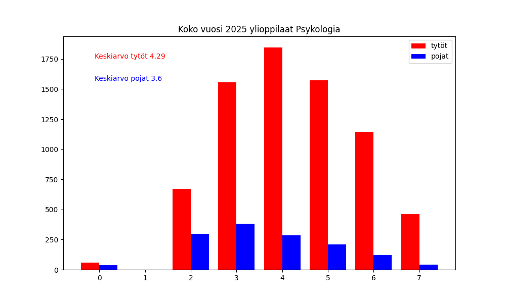Psykologiassa tyttöjen keskiarvo oli 0,69 arvosanaa parempi kuin pojilla. Erotus on tilastollisesti erittäin merkitsevä (p < 0,001)