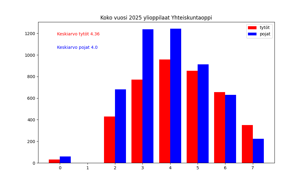 Ylioppilasarvosanojen keskiarvo (puoltoäänien summa/kirjoitettujen aineiden määrä) oli tytöillä 4,35 ja pojilla 4,18.
