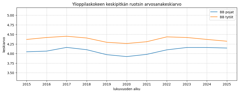 Pitkä englanti on ainoa aine, missä poikien arvosanat ovat reilusti parempia kuin tyttöjen. Tänä vuonna poikien pistekeskiarvo oli 0,33 arvosanaa parempi kuin tytöillä.