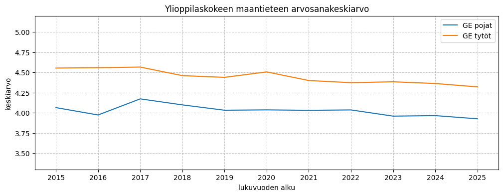 Pitkässä matikassa poikien arvosanat ovat pysyneet noin 0,1 – 0,3 arvosanaa parempina kuin tyttöjen.