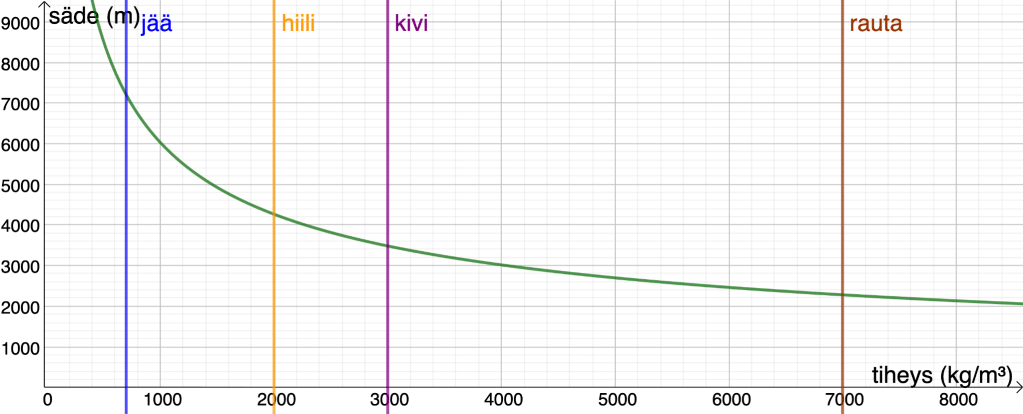 Alla oleva kuvan perusteella näemme, että jos olemme kiviasteroidilla (tiheys noin 3000 kg/m3), jonka säde on alle 3,5 km, niin pääsemme pois asteroidilta hyppäämällä. Jos työskentelet jääplaneetalla, jonka säde on alle 7 km, niin ole varovainen kun hyppelet.