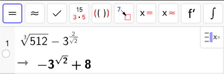 Korjaus CASin tapaan esittää juuria ja potensseja. Kiitos Helena. [nroot(512,3)-3^(2/(sqrt(2)))]