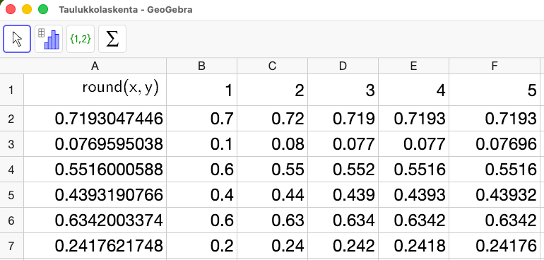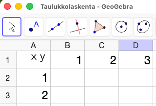 Ohjeen ja kokeilujeni perusteella solun 1 lausekkeessa voi olla erilaisia matemaattisia funktioita, mutta aivan kaikki eivät toimi. Muuttuja x on saa sarakkeen A arvoja ja muuttuja y rivin 1 arvoja. Muuttujien x ja y arvojen tulee aluksi olla lukuja.