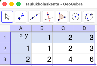 GeoGebran taulukkolaskennassa on ollut aika pitkään Luo operaatiotaulu-toiminto. Tutkitaan mitä sillä voi tehdä. Kirjoitin muutama vuosi sitten artikkelin ”Kertotaulu tai yhteenlaskulaskutaulu taulukkolaskennalla”. Enpä silloin ymmärtänyt, että GeoGebrassa on oma toiminto tällaisia tehtäviä varten.