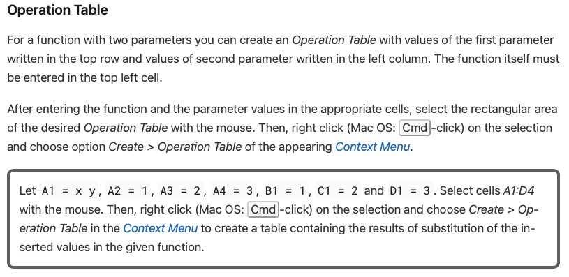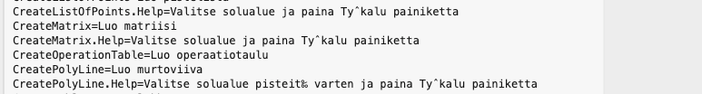 Tämä operaatiotaulu on ollut minulle kadoksissa oleva ominaisuus, vaikka se on ollut GeoGebrassa siitä lähtien, kun GeoGebra 5 ilmestyi. Löysin koneeltani asennustiedoston menu_fi.properties vuodelta 2011. Siellä näkyy käännös ”Luo operaatiotaulu”. Tuo tiedosto on niiltä ajoilta, kun GeoGebra 5 versiota käännettiin suomen kielelle.