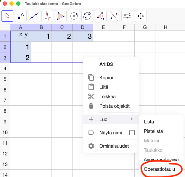 Valitaan alue A1:D3 ja hiiren oikealla painikkeella ilmestyvästä valikosta Luo -> Operaatiotaulu.