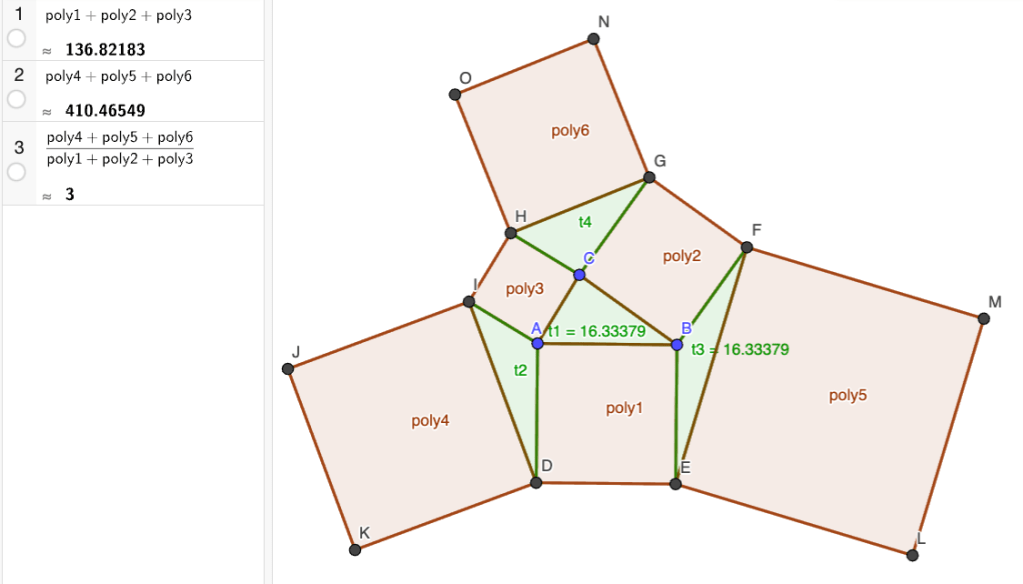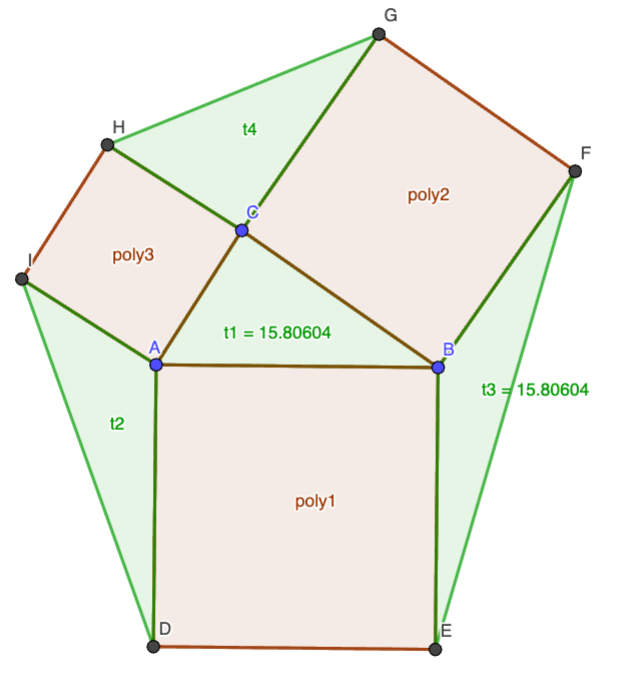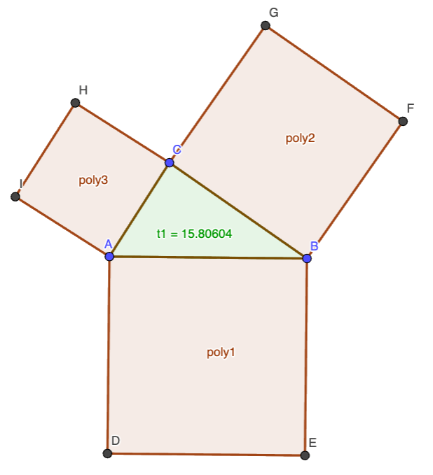 Luodaan kolmion sivuille nelikulmiot ABED, CBFG ja ACHI. Niiden pinta-alat ovat poly1, poly2 ja poly3.