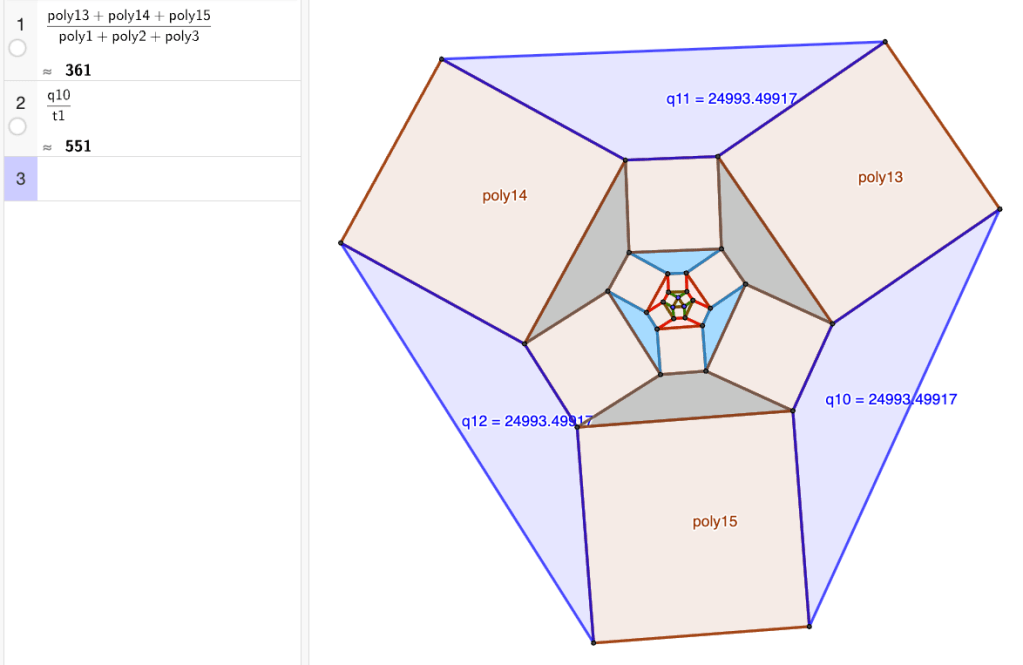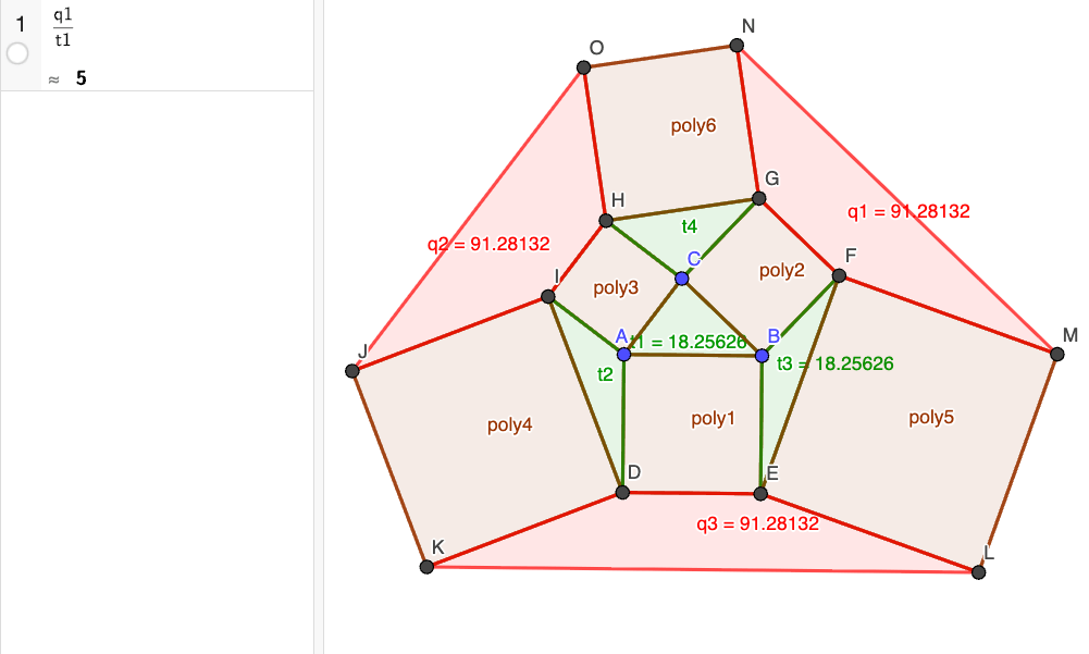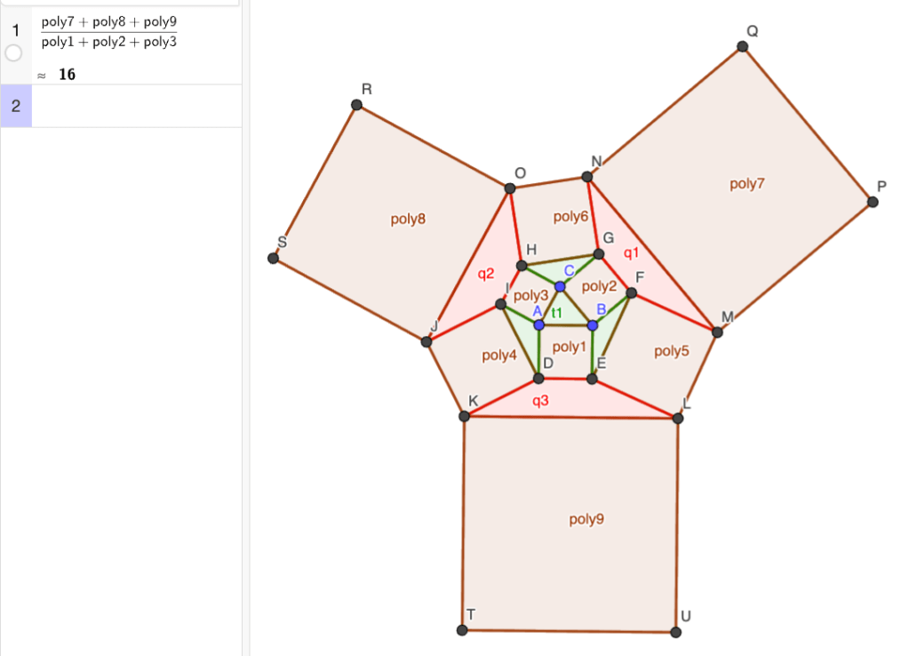 Jatketaan konstruktiota muodostamalla kolmioiden pisimmille sivuille neliöt. Uusien uloimpien neliöiden alat ovat poly4, poly5 ja poly6.