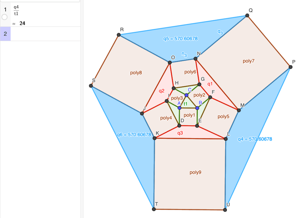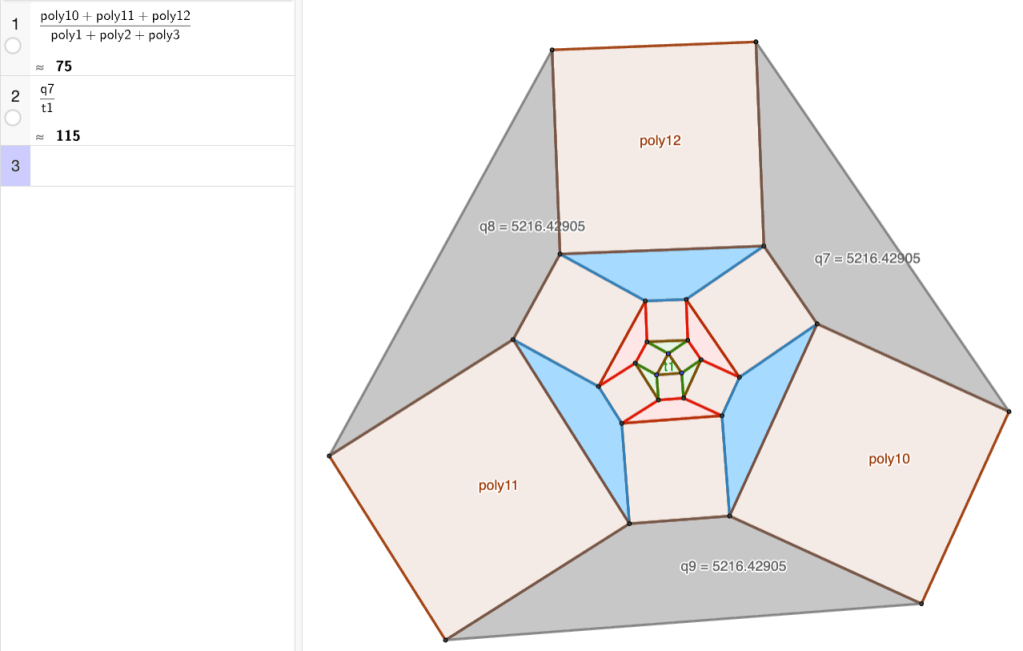 Jatketaan samalla tavalla. Piirretään nelikulmien kärkiin nelikulmiot (kuvassa punaiset). Näiden pinta-alat ovat q1, q2 ja q3.